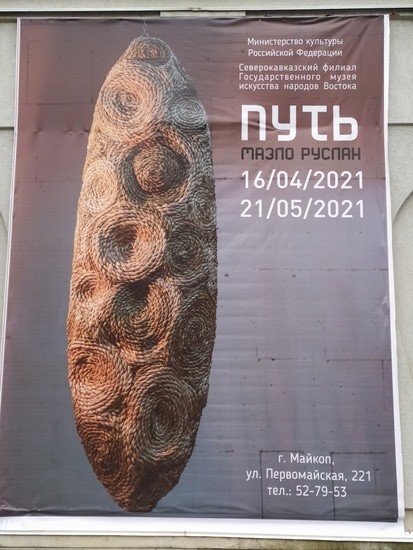 В Майкопе в Северо-Кавказском филиале Музея искусств народов Востока проходит интересная выставка «Путь».  Художник из Нальчика Руслан Мазлоев представил свои работы, основанные на древней адыгской технике плетения циновок. Циновка в аскетичном быту адыга занимала особое место  – в его доме она была украшением и дарила прохладу, на специальных циновках возносили молитву Всевышнему, а когда наступал отмеренный срок, на циновке человека провожали в последний небесный путь. Все, что Руслан делает – это и сохранение традиций, и их развитие одновременно.