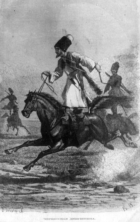 Черкесская джигитовка. Иллюстрация из личного архива Ибрагима Наврузова, директора Адыгейского краеведческого музея в 1930-е гг.
