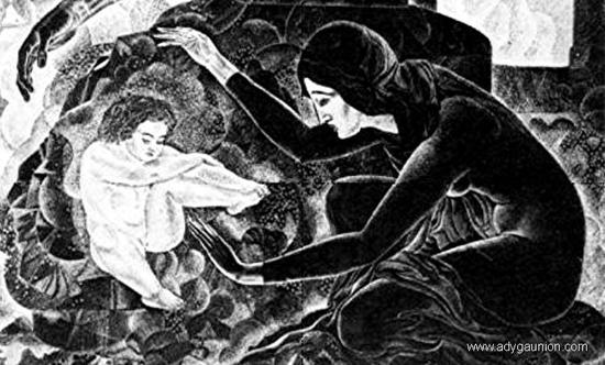 У адыгского художника Феликса Петуваша - это цикл, посвященный нартским сказаниям. Это картина, на которой - знаменитый нартский сюжет  рождения у прародительницы нартов Сатэнай мальчика из камня - Саусруко.