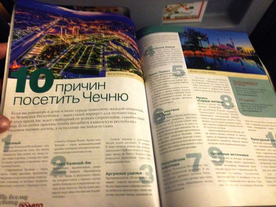 Как я уже не раз писал, мне приходится очень часто летать самолетами, в том числе и за рубеж. Совсем недавно, возвращаясь с семинара в Турции самолетом Оренбургских авиалиний, я открыл лежавший в кармане впередистоящего сидения журнал, и был приятно удивлен. Я искренне порадовался за братьев чеченцев, увидев статью на несколько страниц с красочными иллюстрациями. В журнале рассказывалось о «Десяти причинах посетить Чечню». Такие журналы обычно печатают авиаперевозчики и распространяют их на бортах своих самолетов, но естественно они не продаются, а лежат для чтения пассажирами на время полета.
