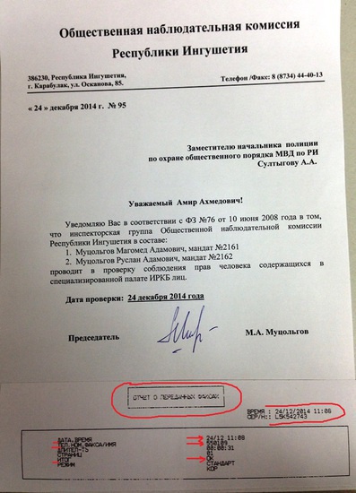 23 декабря, Общественная наблюдательная комиссия Республики Ингушетия планировала проведение проверки соблюдения прав человека содержащихся в специализированной палате ИРКБ лиц. Несмотря на направленное в соответствии с действующим законодательством уведомление в адрес МВД по РИ, сотрудники полиции воспрепятствовали деятельности Комиссии и сорвали проверку. Заместитель начальника полиции по охране общественного порядка МВД по РИ Султыгов А.А., утверждал что не получил направленное Комиссией уведомление, это при том, что повторное уведомление было сделано по телефону. Сегодня, 24 декабря, ситуация повторилась. Попытка направить новое уведомление о планируемой проверке в секретариат Султыгова А.А., вновь не увенчалась успехом, как и вчера, телефоны никто не поднимал, а автоматически включавшийся раньше факс так и не включился, поэтому уведомление было направлено в Канцелярию МВД по РИ.