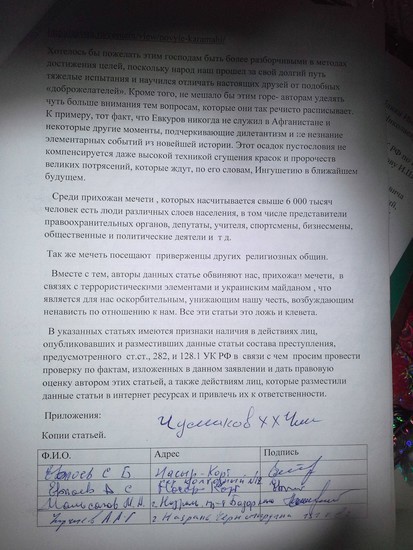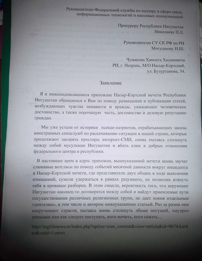 Я и нижеподписавшиеся прихожане Насыр-Кортской мечети Республики Ингушетия обращаемся к Вам по поводу размещения и публикации статей, возбуждающих чувства ненависти и вражды, унижающее человеческое достоинство, а также порочащую честь, достоинство и деловую репутацию граждан.