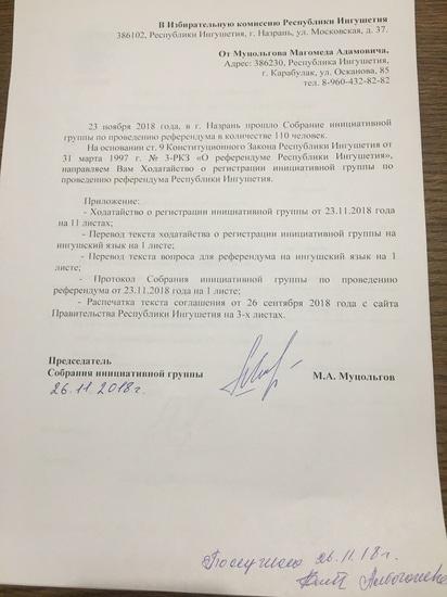 Сегодня, 26 ноября, от имени инициативной группы жителей Ингушетии, сдал в республиканский Избирком необходимые документы, для начала к назначению и подготовки республиканского референдума. В поданном ходатайстве, мы просим Избирательную комиссию Республики Ингушетия зарегистрировать инициативную группу по проведению референдума Республики Ингушетия с постановкой на референдум вопроса: