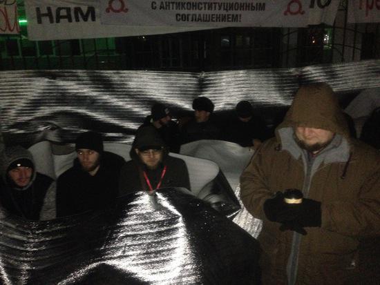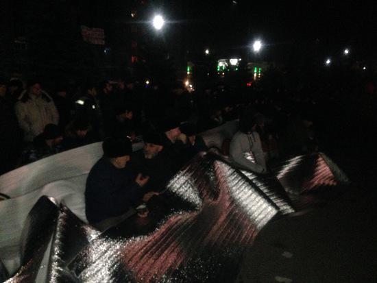 Пока религиозные деятели, собравшись в круг совершают обряд Зикр, оставшаяся часть митингующих укутавшись в пледы и подложку, пытаются не замерзнуть. На улице около «0» градусов.