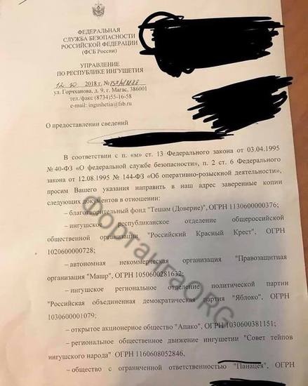 Осенью 2018 года, практически сразу по окончанию двухнедельного многотысячного митинга в Магасе, в сеть попала фотография очень интересного документа. Это был запрос Управления ФСБ по Ингушетии, в один из госорганов, в котором содержалось требование предоставления информации, по различным юридическим лицам и индивидуальным предпринимателям. Спецслужбы собирали информацию о различных общественных и коммерческих организаций. Объединяло их все то, что в числе их учредителей либо руководителей, являлись представители общественности и гражданские активисты. Я уверен, что перечень этих организаций конечно же не исчерпывающий и возможно это был не единственный такой запрос. Тогда об этом было много чего написано, в том числе и вот по этим ссылкам https://www.kavkazr.com/a/29551453.html и https://news.myseldon.com/ru/news/index/197170079?requestId=fbd3a72a-4014-42d7-8aed-11189c7b4b96.