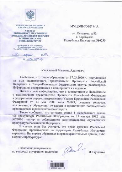 Сегодня я получил ответ из аппарата Полпреда президента в СКФО. Ознакомившись с ответом я понимаю, что сотрудники аппарата Чайки ответили исключительно формально. Они пишут мне о том, о чем их не просили, никто не просил их подменять собой какие-либо органы.
