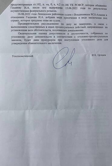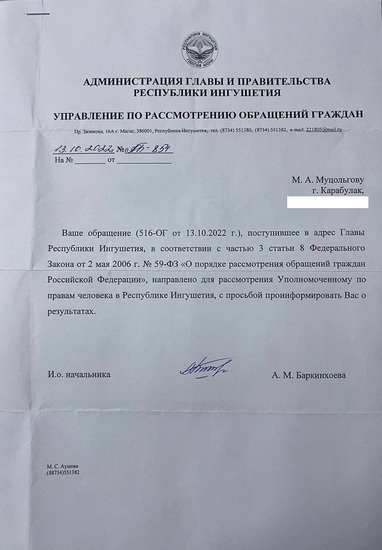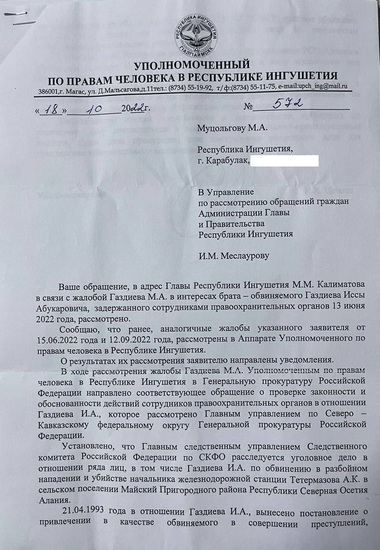 В начале октября я обратился в адрес главы республики Калиматова, с просьбой оказать содействия в защите и обеспечении конституционных прав 56-летнего жителя Пригородного района Иссы Газдиева, преследуемого по весьма мутному уголовному делу, имеющему за плечами 30-летнию историю. Там же я обратил внимание главы и на системную проблему, которая несет в себе угрозу безопасности любого жителя Пригородного района, ингушской национальности.