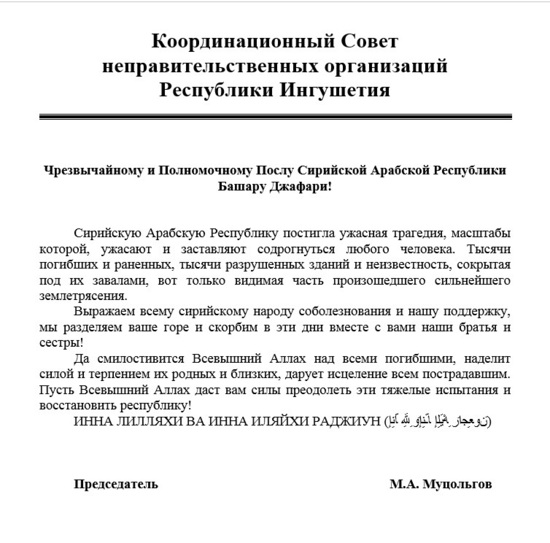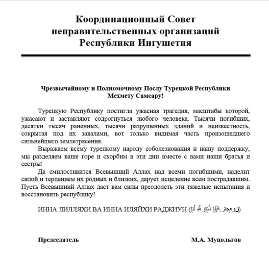 Координационный совет неправительственных организаций Республики Ингушетия в свою очередь направил письма со словами поддержки и соболезнования в посольства Турецкой и Сирийской республик.