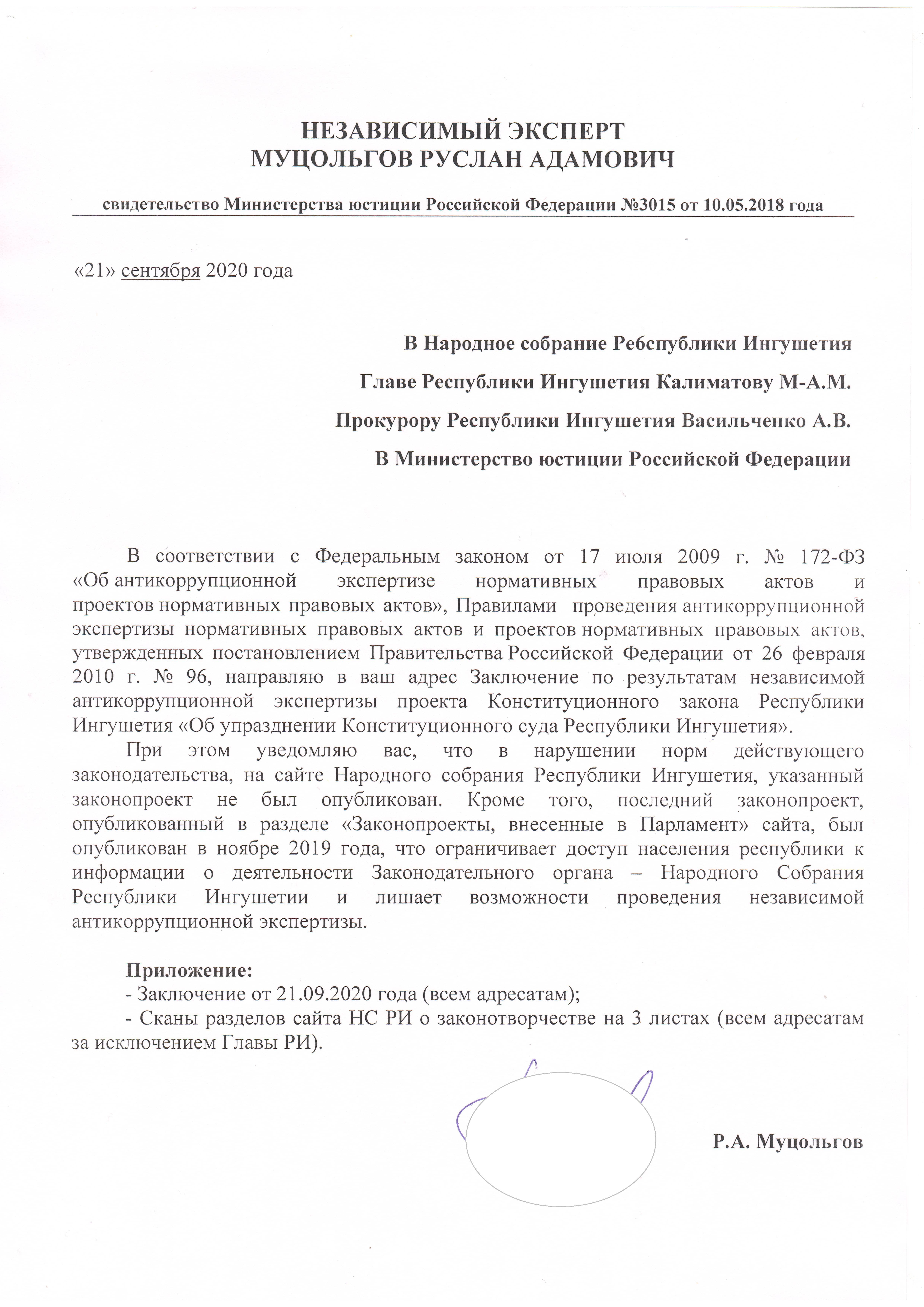 В сентябре этого года, в материале «Антикоррупционная экспертиза проекта закона об упразднении Конституционного суда» вот по этой ссылке https://www.kavkaz-uzel.eu/blogs/342/posts/45174, я публиковал заключение моего брата Руслана Муцольгова, по результатам антикоррупционной экспертизы законопроекта о ликвидации Конституционного суда Ингушетии, который внес глава республики Махмуд-Али Калиматов. Как и положено, заключение эксперта было направлено в адрес Народного собрания, главы и прокурора Республики Ингушетия.