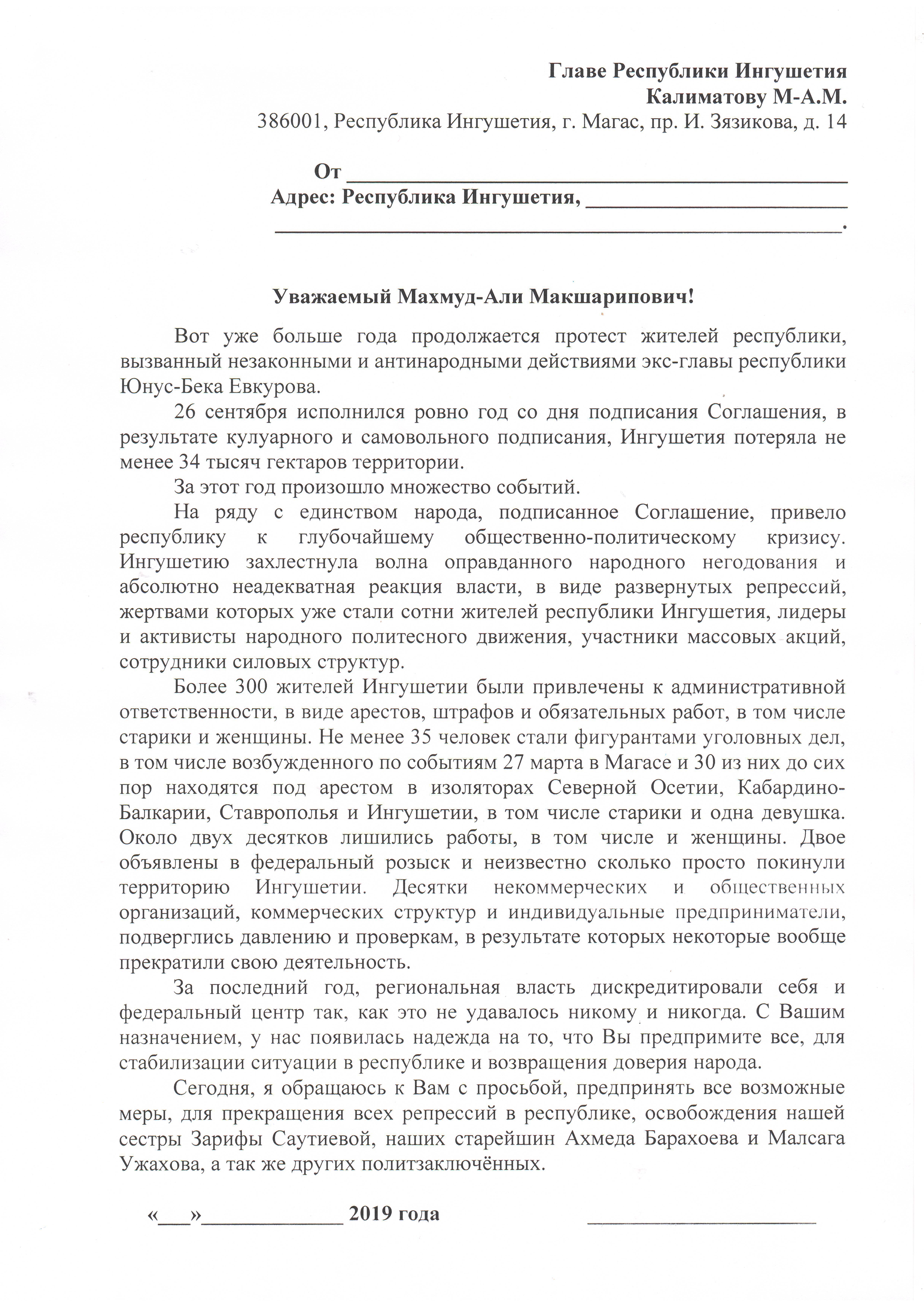 Вот по этой ссылке, https://www.kavkaz-uzel.eu/blogs/342/posts/39875, некоторое время назад, я обратился в адрес Калиматова с обращением по нашим политзаключенным. В своем обращении к главе Ингушетии я просил его предпринять все возможные меры, для прекращения всех репрессий в республике, освобождения нашей сестры Зарифы Саутиевой, наших старейшин Ахмеда Барахоева и Малсага Ужахова, а так же других политзаключённых.