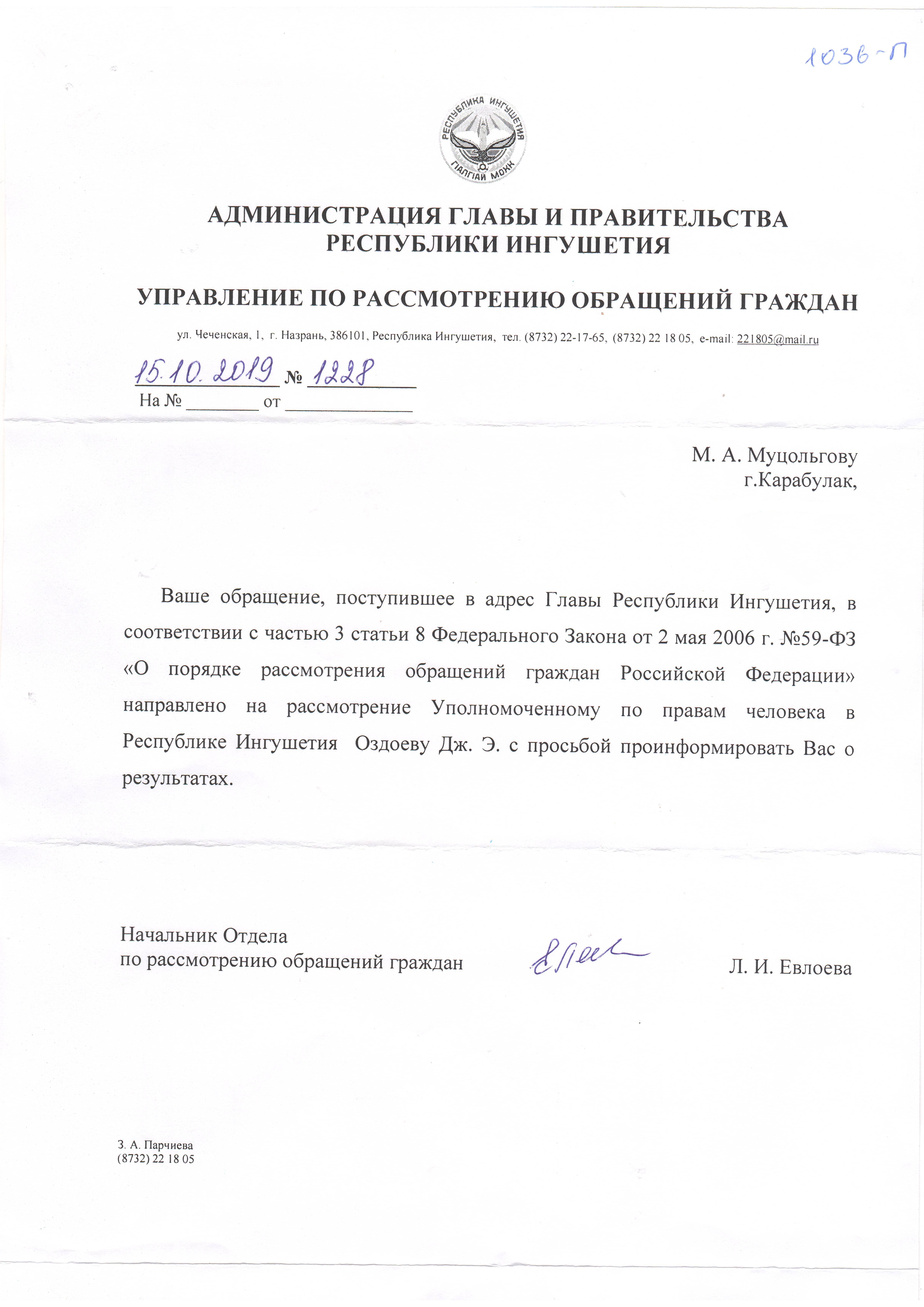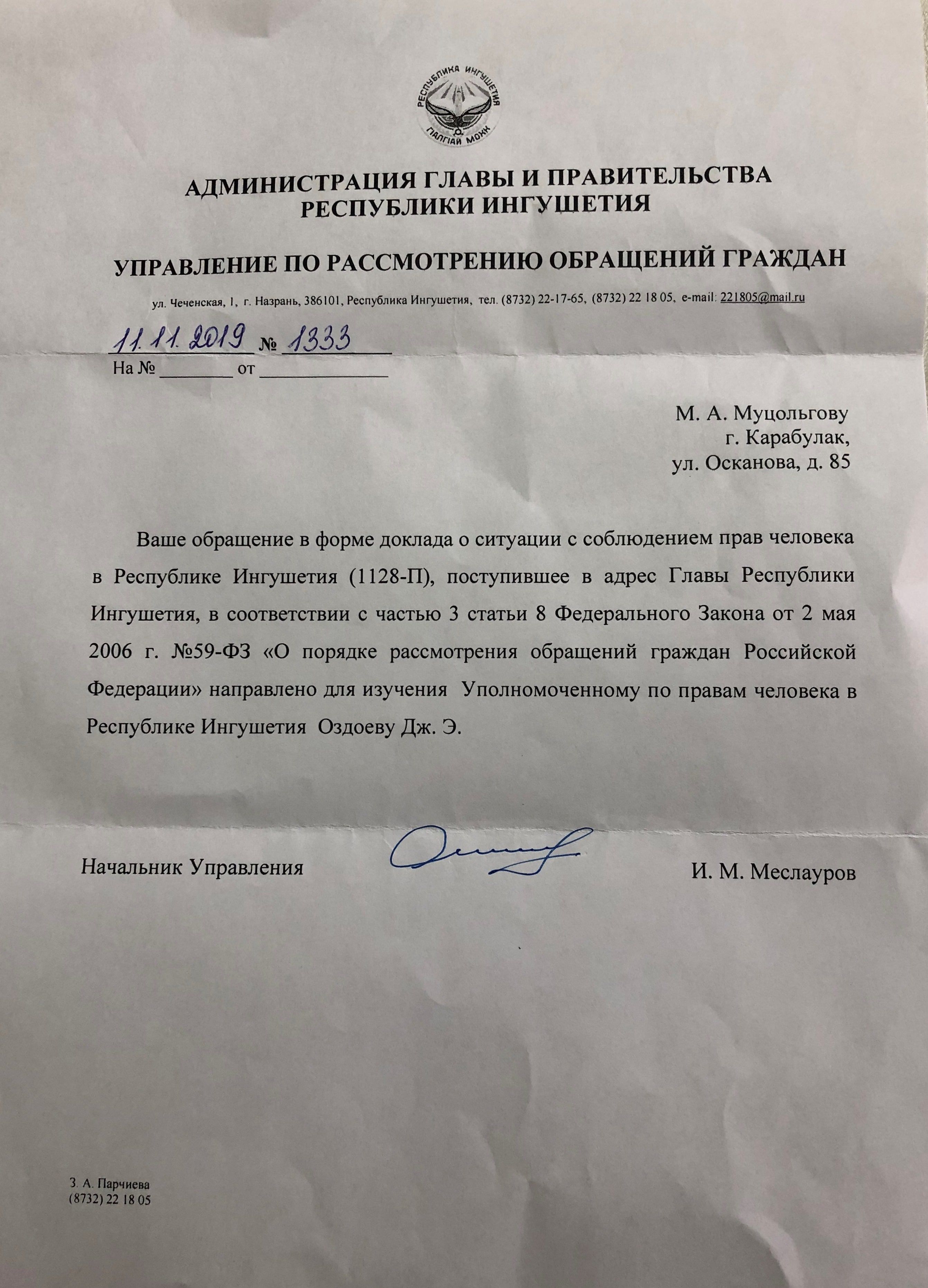 Вот по этой ссылке, https://www.kavkaz-uzel.eu/blogs/342/posts/39875, некоторое время назад, я обратился в адрес Калиматова с обращением по нашим политзаключенным. В своем обращении к главе Ингушетии я просил его предпринять все возможные меры, для прекращения всех репрессий в республике, освобождения нашей сестры Зарифы Саутиевой, наших старейшин Ахмеда Барахоева и Малсага Ужахова, а так же других политзаключённых. Спустя некоторое время, вот по этой ссылке https://www.kavkaz-uzel.eu/blogs/342/posts/40242, я опубликовал ответ из администрации главы. По Федеральному закону №59 «О ПОРЯДКЕ РАССМОТРЕНИЯ ОБРАЩЕНИЙ ГРАЖДАН РОССИЙСКОЙ ФЕДЕРАЦИИ», это обращение должно было быть рассмотрено главой, но вопреки этому закону, он переправил мое обращение в адрес Уполномоченного по правам человека в Республике Ингушетия Джамбулата Оздоева, для рассмотрения и поручением дать мне ответ.