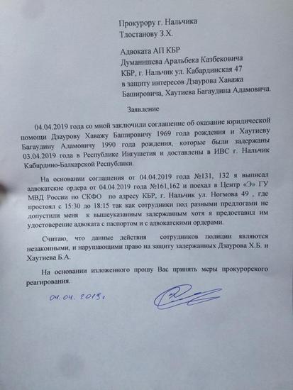 Адвокат Аральбек Думанишев заявил о недопуске к задержанным 3 апреля в Ингушетии и содержащимся в Нальчикском изоляторе молодым людям Багаудину Хаутиеву и Хаважу Дзаурову.