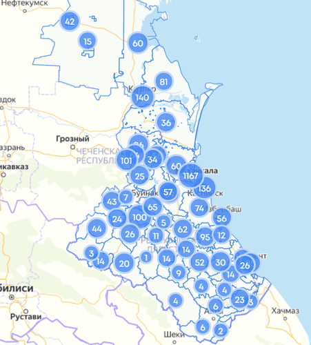 Скриншот карты распространения коронавируса в Дагестане по состоянию на 15 мая 2020 года, https://mydagestan.e-dag.ru