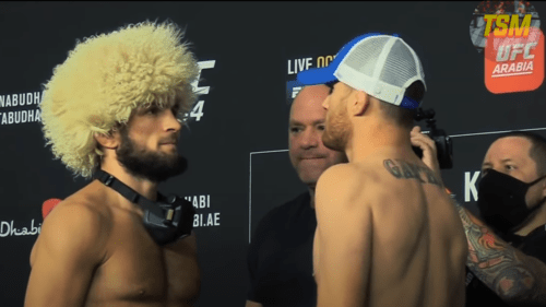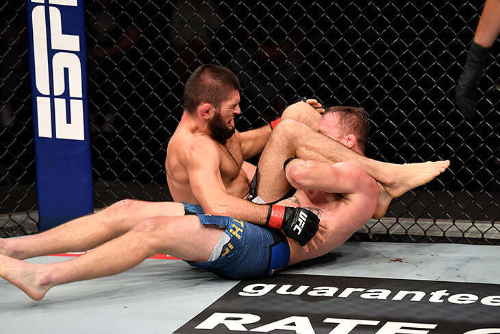 Источник: Хабиб Нурмагомедов (слева) и Джастин Гэтжи (справа). Стоп-кадр видео https://youtu.be/t-SnPHz4J9M