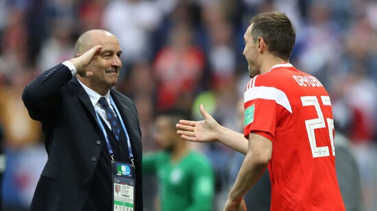 14 июня 2018. Москва. Лужники. Россия — Саудовская Аравия — 5:0. 71-я минута. Артем Дзюба (справа) принимает поздравления от Станислава Черчесова после забитого гола. Фото Reuters