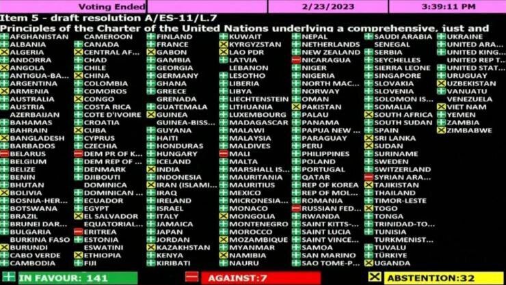 Против резолюции свою позицию зафиксировали Россия, Беларусь, Сирия, Северная Корея, Эритрея, Никарагуа и Мали. 32 страны воздержались.