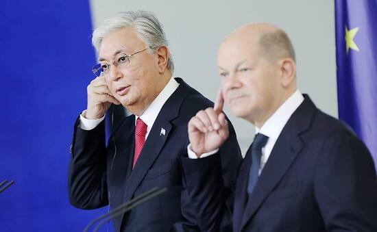 На фото: канцлер Германии Олаф Шольц (справа) и президент Казахстана Касым-Жомарт Токаев (слева) на совместной пресс-конференции (Фото: IMAGO/dts Nachrichtenagentur)
