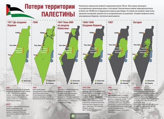 "Ну Израиль создан, как известно, а Палестина как государство, самостоятельно, суверенное, так и не создано, не состоялось. В силу самых разных обстоятельств. Сейчас не буду вдаваться в детали... Более того часть земель, которые палестинцы считали всегда исконно палестинскими, она занята Израилем - в разное время и разными способами, но в основном, конечно, с помощью военной силы":
