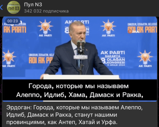 Некоторые СМИ сообщали, что накануне в своей речи на съезде правящей Партии справедливости и развития в Коджаэли Эрдоган якобы заявил о намерении присоединить к Турции несколько сирийских городов и пересмотреть границу между двумя странами, сложившуюся по итогам Первой мировой войны.