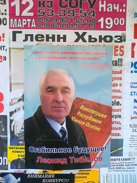 вчера утром заметил в городе первые признаки приближающихся выборов в ЮО. "тибиловцы" развесили в центре плакаты своего кандидата. действовали при этом очень беспардонно, до концерта Глена Хьюза был еще целый день, а они его вот так жестко заклеили. то ли рок не любят, то ли просто им наплевать на все. скорей конечно второе. и откуда-то возникшая уверенность, что выборы выиграет именно этот человек, бывший кгбешник. или их бывших не бывает? законно избранный президент президент Алла Джиоева между тем продолжает оставаться в больнице, откуда обращается к Путину. не совсем пойму она до сих пор там, если это был всего лишь гиппертонический криз? больше подробностей о предвыборной компании в самой ЮО в сегодняшнем посте Сослана "Слоганы и фактор субэлиты".