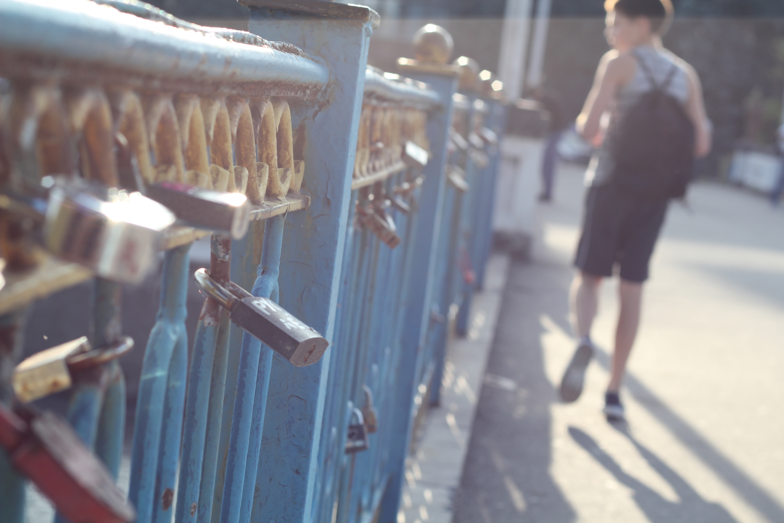 через пешеходный мост, где все вешают замки, когда женятся, но никто не снимает, когда разводятся