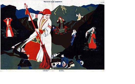 Плакат с двусмысленным названием «Чистота – залог здоровья» (1923), на котором изображена мужеподобная горянка-великанша  в красной косынке и с открытым лицом, призывал горянок выметать традиции, словно мусор. С сайта polit.ru