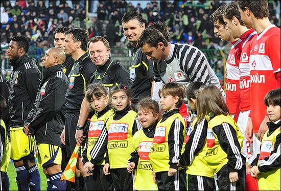 Интересно, чем так напугали спартаковцы бедного ребёнка, что девочка расплакалась прямо на предматчевой церемонии? Может быть, это реакция на жест мальчика справа от неё "а-ля Аршавин", в таком случае в Махачкале подрастает тонкий ценитель футбола. Впрочем, и сам "Спартак" сейчас никаких других эмоций не вызывает. В результате всех этих маленьких трагикомедий, Эйден Макгиди вообще остался без ребёнка.