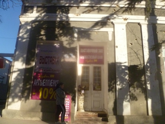 А вот Художественный салон и магазин"Сувенир Ир"  совмещенный с ним. По-осетински написано только «обвал цен» типа  типа Sale%!  Название правда только на русском, но и сувениры то тоже  в основном для приезжих.  Хотя приезжающие  в Цхинвал, осетинский  еще помнить должны.