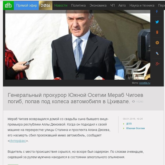 Страшное происшествие, просто становится не по себе. Смерть на свадьбе. Был сбит проезжающим автомобилем Генеральный прокурор РЮО, Мераб Чигоев. Личность более чем известная в республике, он в 96-м, став прокурором , оставлял этот пост, что бы занять кресло председателя правительства и министра юстиции. Да и свадьба была, у сына экс-кандидата в президенты Республики, Аллы Джиоевой, которая по сути, выиграла выборы, но в результате политических игр Москва - Цхинвал, так и не дала клятву на Конституции.