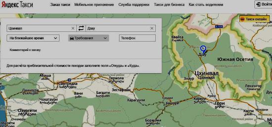 А до этого, в августе, не подумав, Яндекс запустил в Грузии свою службу такси по интернет вызову. Тогда шуму было еще больше! Грузинские клиенты вызывая такси  вдруг обнаруживали на картах Яндекс - Южную Осетию. Естественно разразился скандал, дело доходило до рукоприкладства.   "Яндекс. Такси" обвинили в нарушении грузинского законодательства,  а имено, закона "Об оккупированных территориях Грузии". Потом сообщили что "Яндекс" изменила свои карты для грузинских пользователей. Посмотрел карты Грузии на сайте Яндекс-такси. Вроде есть и Абхазия и Южная Осетия, правда без «Республик».
