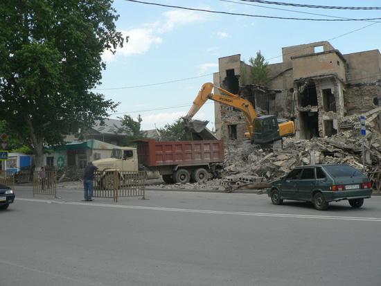 А вот в центре города на Богири, уже какой день рушат Универмаг, в своё время центральная торговая точка города, он сгорел 09.08.2008. На его месте будет сквер, что конечно украсит и сделает главную городскую развилку полегче и поуютнее. Правда, я бы кирпичнно-бетонную часть все таки оставил. Под какие ни будь клубы, кафе, общественные заведения, Площади которое занимали торговые залы, вполне достаточно для сквера. Но строители сами говорят, что легче возвести новое здание, чем восстанавливать старое. Но мы ж не раз убеждались что, то, что легче для строителей не всегда лучше для горожан.