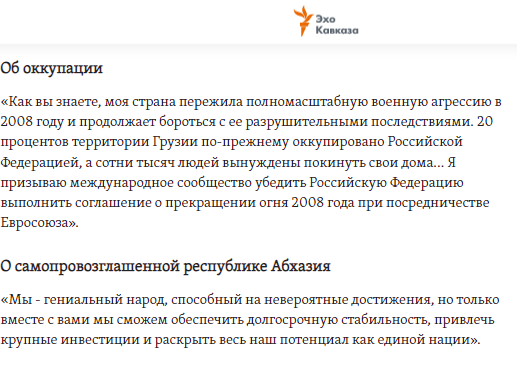 На самом деле я утрирую и пишу, ориентируясь на публикацию на "Эхо Кавказа", где решили что из абзаца, начинающегося в действительности со слов «я обращаюсь к нашим абхазским и осетинским братьям и сестрам», эти слова можно убрать и назвать его «О самопровозглашенной республике Абхазия».