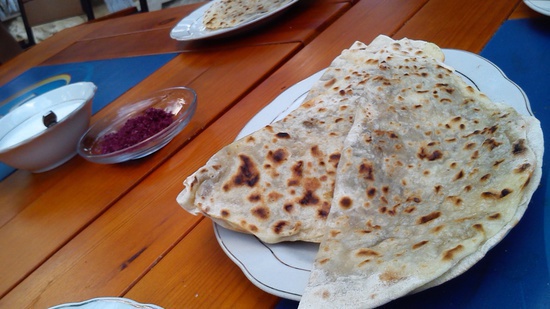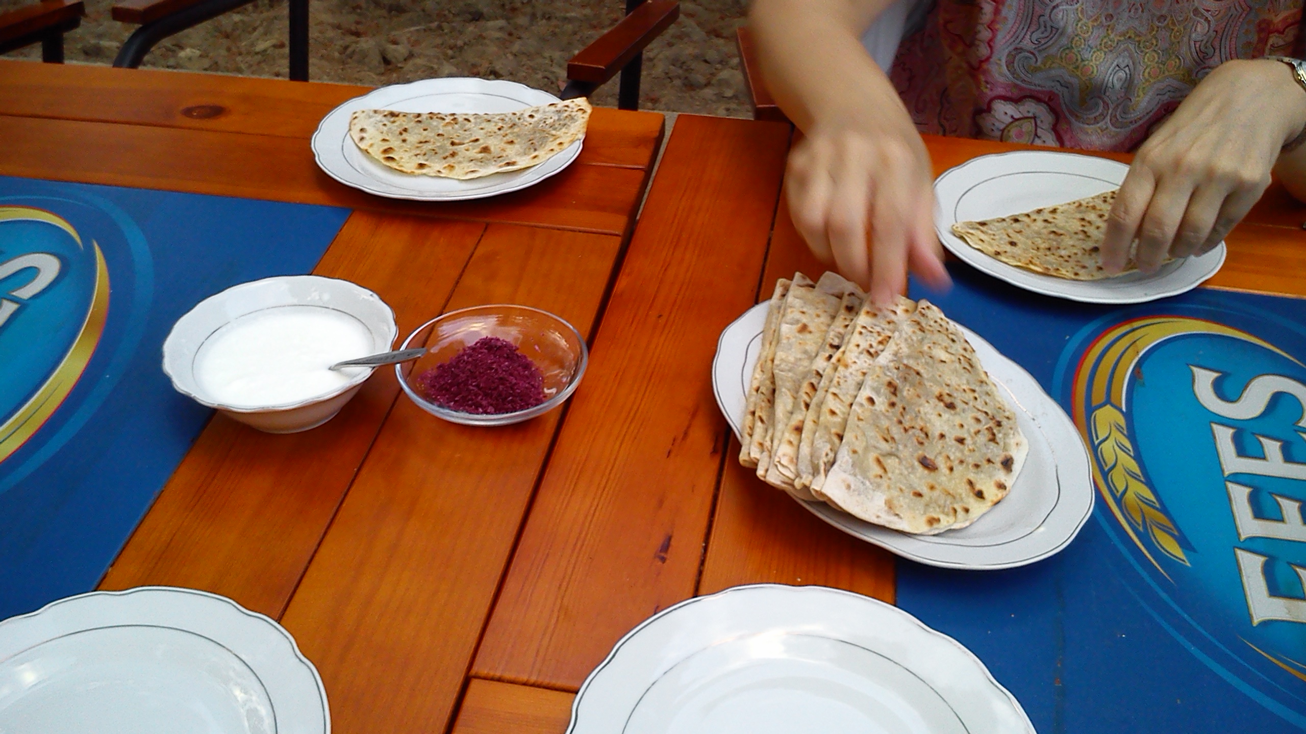 В прошлое воскресенье ел кутабы на побережье, расхваливал и расписывал вкус этого типично азербайджанского блюда, а фотографии не поставил. Не снимал тогда. Неделю жгло, что не показал тогда эти кутабы и сегодня, вернувшись вновь из Бильгя, размещаю снимки – вот они, из раскатанного сложенного теста с мясным фаршем (плюс лук) или зеленью, макаем в мацони и посыпаем сумахом – кислая сушеная трава, ее название в прошлый раз позабыл.