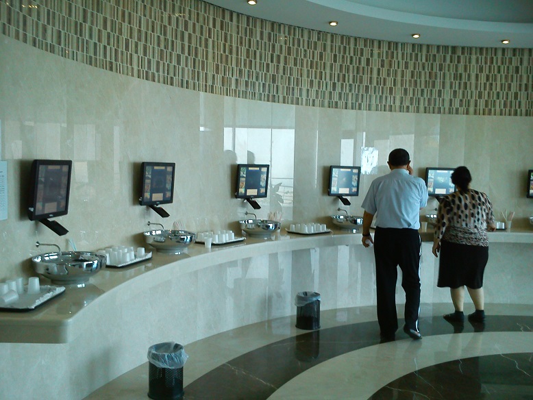 зал для приема серной воды с компьютерными автоматами-наливайками