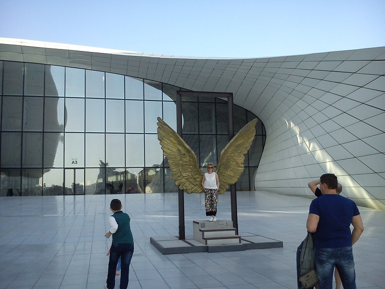Центр Гейдара Алиева - уникальное архитектурное творение Заха Хадид, назван лучшим зданием мира в 1914 году. Центр открыт в 2012-м, в нем размещены музеи, постоянные и сменяющиеся выставки, конференц-зал. Вход в здание был в тот час закрыт. Для обозрения его внутреннего вида, вида сзади и вообще если хотите смотреть фотографии Центра сделанные профессионалами, лучше открыть в Википедия или любом другом сайте.