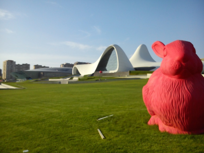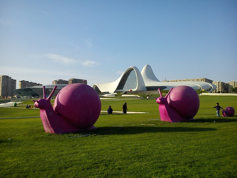 Улитки и кролики вокруг Центра - интересная штука, создающие умиление и поднимающие настроения. Смысла у них никакого нет. Просто тут на траве была выставка различных современных скульптур и автор этих животных оставил их в Баку, подарив городу. Думаю, перевозить их домой к автору оказалось бы дороже. Милые создания, создающие аналогию с инопланетными пришельцами