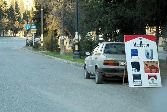 Второй доказательный пример из этого ряда. Журналист Вюгар Мустафаев снял на улицах Баку много фотофактов открытой продажи контрабанных сигарет. Я и не знал - продаются в каких-то самодельных фанерных устройствах, в непригодных автомобилях и даже в легальных газетных киосках.