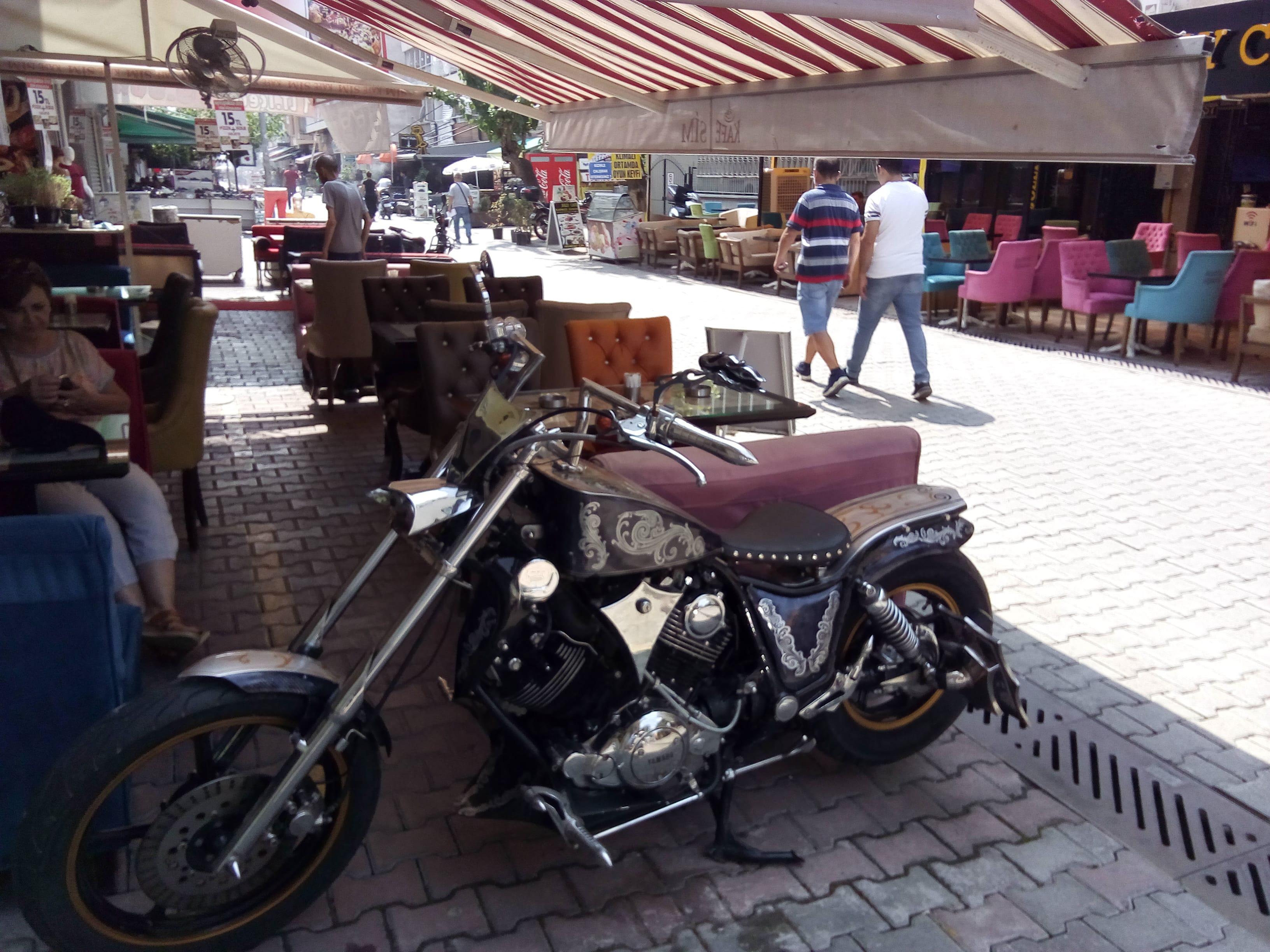 Измира носит название Смирна. В Измире народ модно одевается, мы пили кофе и потом чай в кафе байкеров Я сфотографировал сделанный на заказ мотоцикл. в исторической части Измира разумеется как во всех нормальных городах древняя крепость и замок а также старые жилые постройки в которых как в других турецких городах сейчас работает крупный рынок. А центр Измира это площадь называемая Саат Куллеси то есть башня с часами . рядом с ней маленькая мечеть . я туда зашел типично османская архитектура на потолке красивая восточная каллиграфическая вязь.