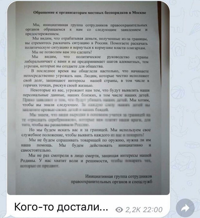 В тексте от силовиков, который я взял из RIA.RU они говорят о либеральничаньи Путина, а в затушеванной части обращения прочитывается угроза детям оппозиционеров. В действительности Путин уже показывает своим генералам, что он не мягкий парниша. Это видно по событиям в аэропорте Сочи, где увольняют армян, по арестам оппозиционеров - около 300 человек в Москве задержаны за один день последнего митинга.