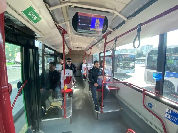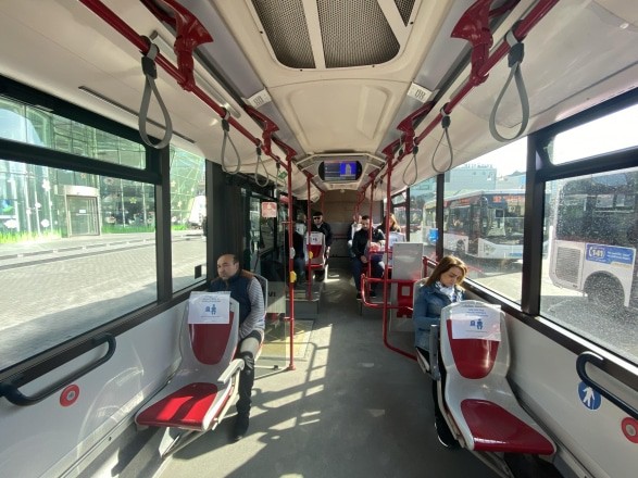 Опубликованы фотографии автобусов компании Bakubaus, а писал о них когда сообщал о поломанных устройствах для очистки рук пассажиров. В автобусах требуется соблюдение двухметрового расстояния между пассажирами, на двухместное сиденье может сидеть только один пассажир.