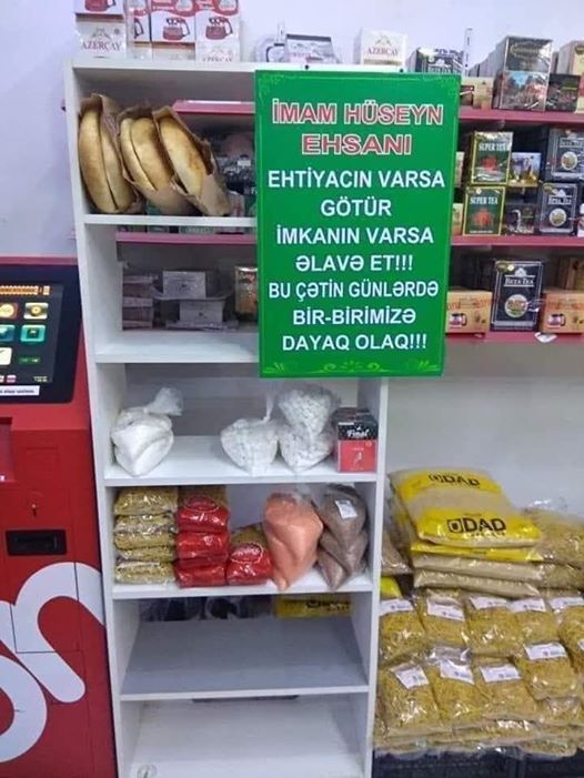 Есть другой способ помощи ближнему по азербайджански. На фото стенд в бакинском магазине, на нем написано: если неимущий, тогда бери бесплатно, если имущий - помоги другому.  Был бы я в этом магазине оплатил бы благотворительные продукты обязательно.