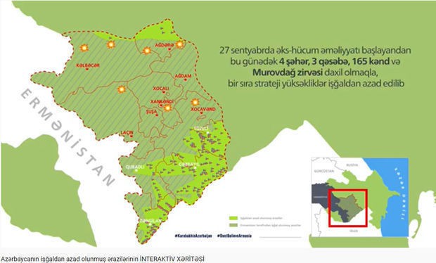Обновленная карта деоккупированных территорий Азербайджана. На ней указаны четыре города, три поселка, 165 сел и горный хребет Муровдаг, освобожденные в результате начавшегося 27 сентября контрнаступления азербайджанской армии в ответ на провокации вооруженных сил Армении.