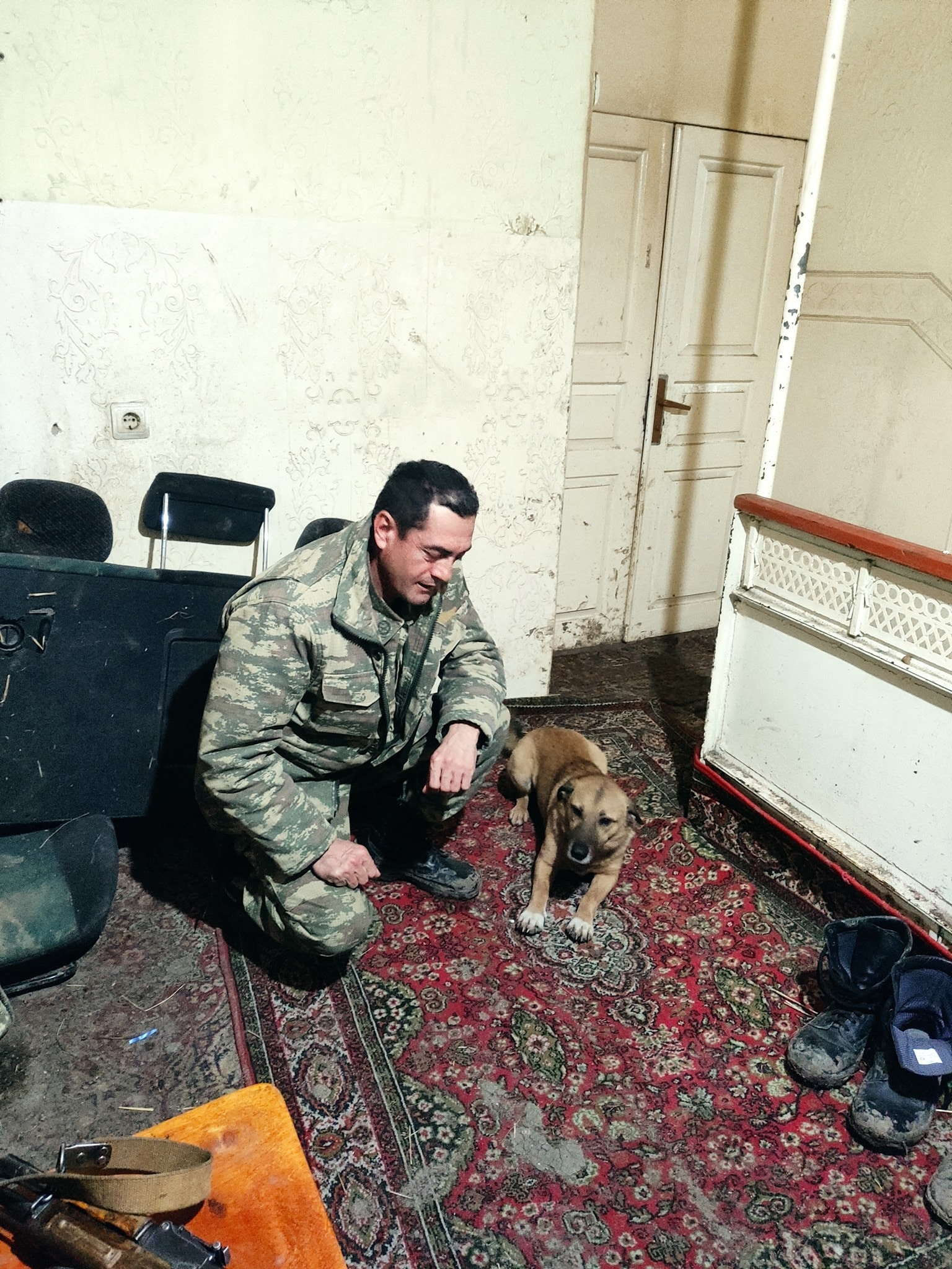 На следующем фото капитан-журналист Мегрур Али Полад, поделился фронтовой фотографией, на ней он снят с дворнягой Дипи, которая ездила с ними в военном автомобиле по всем фронтам - от Физули до города Шуша. Мегрур уволился, вспоминает былое, а собака осталась с армией в Шуше. Она ни разу не убежала с позиций во время обстрела, она же первой вбегала в убежище, а когда поступал приказ менять позиции, первой запрыгивала на заднее сиденье машины.