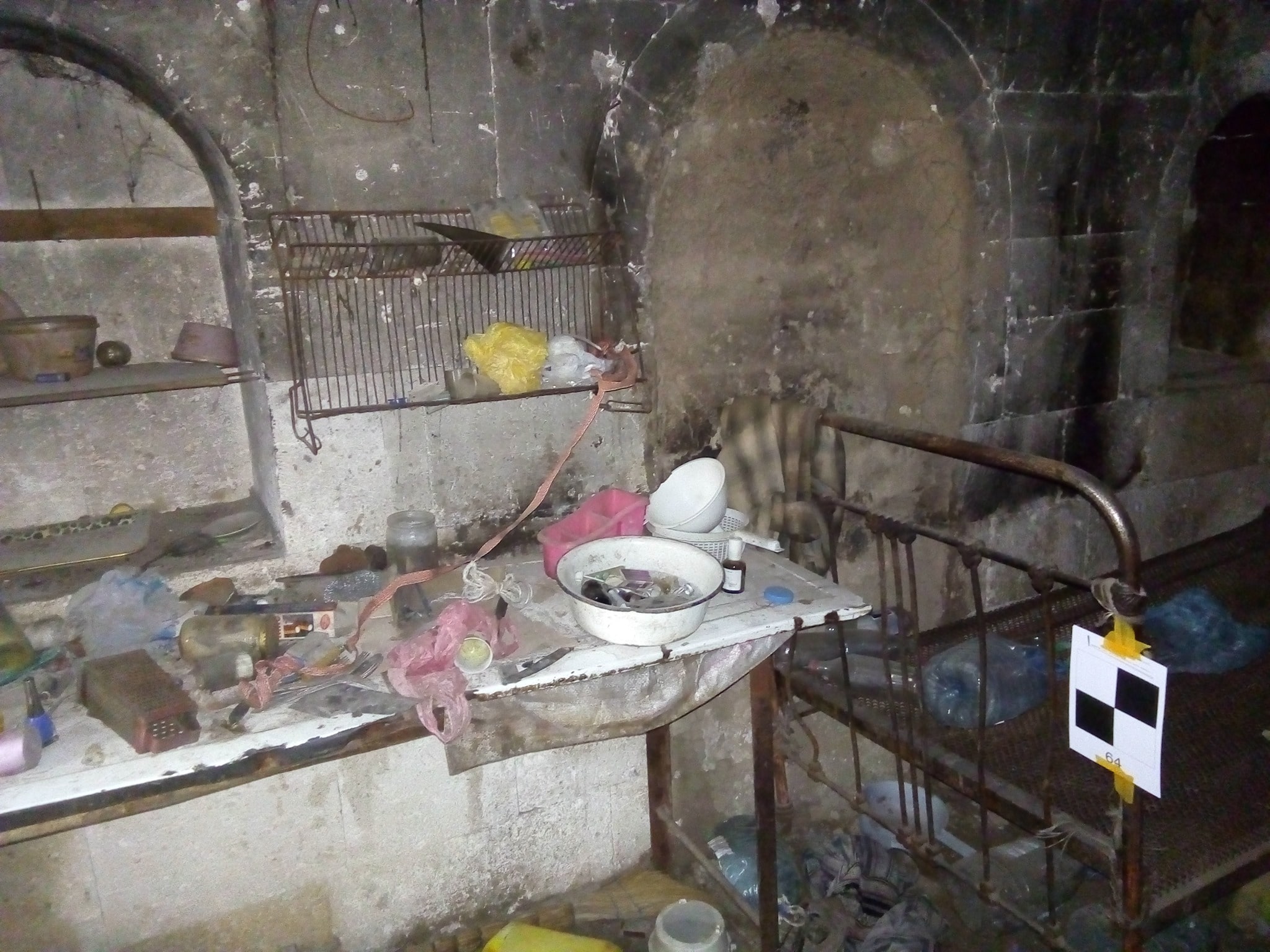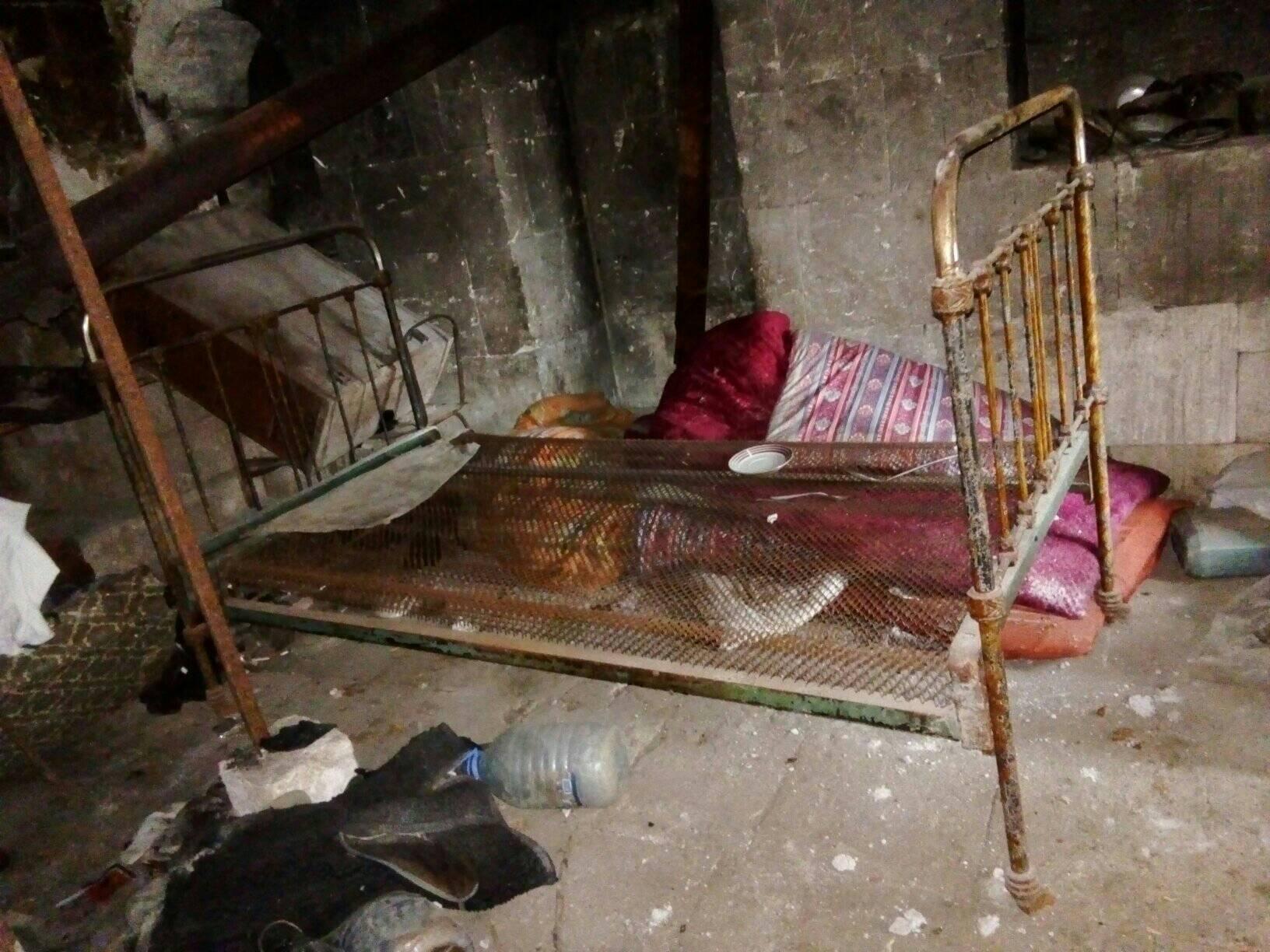 Рядом, в другом склепе, а может это строение имело другое предназначение, жил двуногий скот: остались четыре железные кровати и стол, заваленный пищевыми отбросами. На земле армянская военная форма,  на столе во дворе остались обезвреженные боеприпасы, фильтр от противогаза.