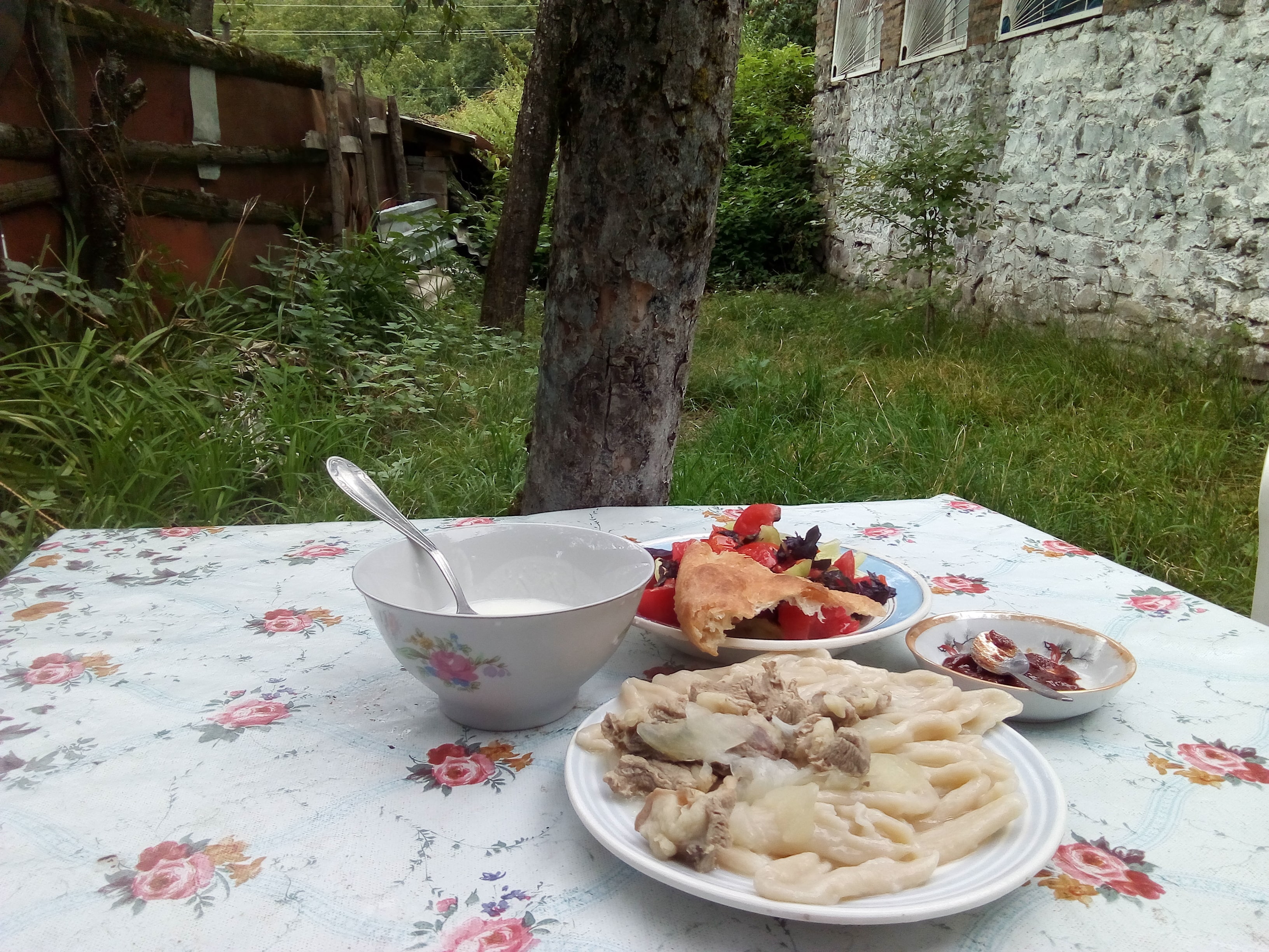 Дома продолжил воскресенье. Надо себя побаловать изысканной кухней. Гречневая и манная каши, недельный борщ без мяса надоели. Вчера купил килограмм баранины, а в Гахе взял сто полуфабрикатов - местного деликатеса, особым образом приготовленные заготовочки из теста. Сварил полуфабрикаты и мясо, быстро сварганил мацони с чесноком, в отдельной тарелочке кислятины из алычи, и все - мужская еда азербайджанских пастухов с северо-запада страны готова - Сюрфюллю!