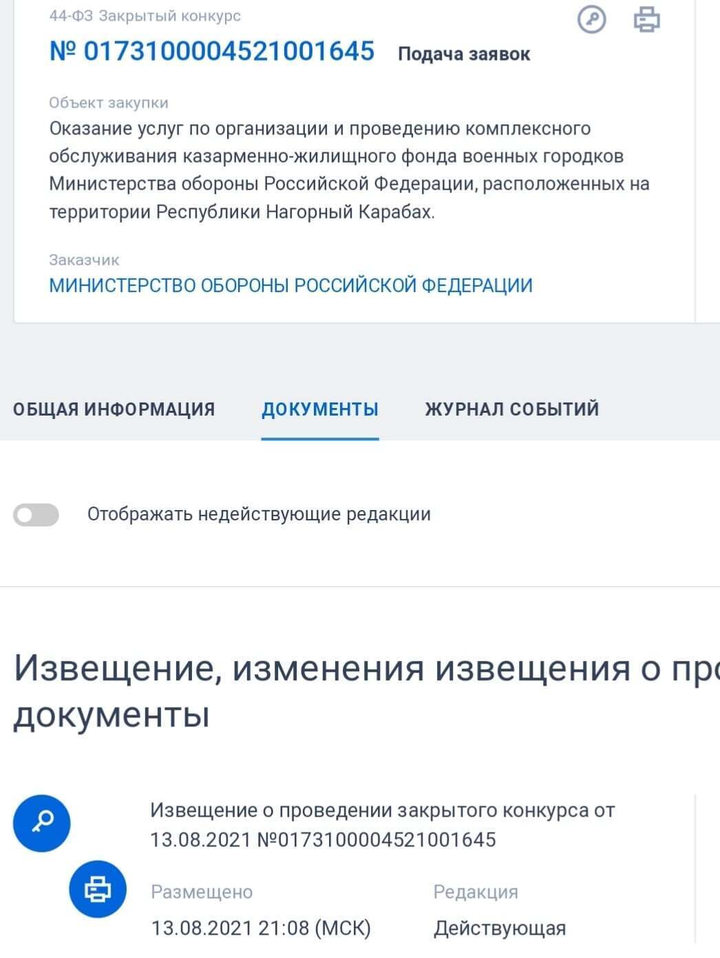 Поясняю: Минообороны РФ объявило конкурс (тендер) на компанию из РФ, которая будет обслуживать казармы мифотворцев в Гарабахе. При этом территорию называет так, как вы прочитали.