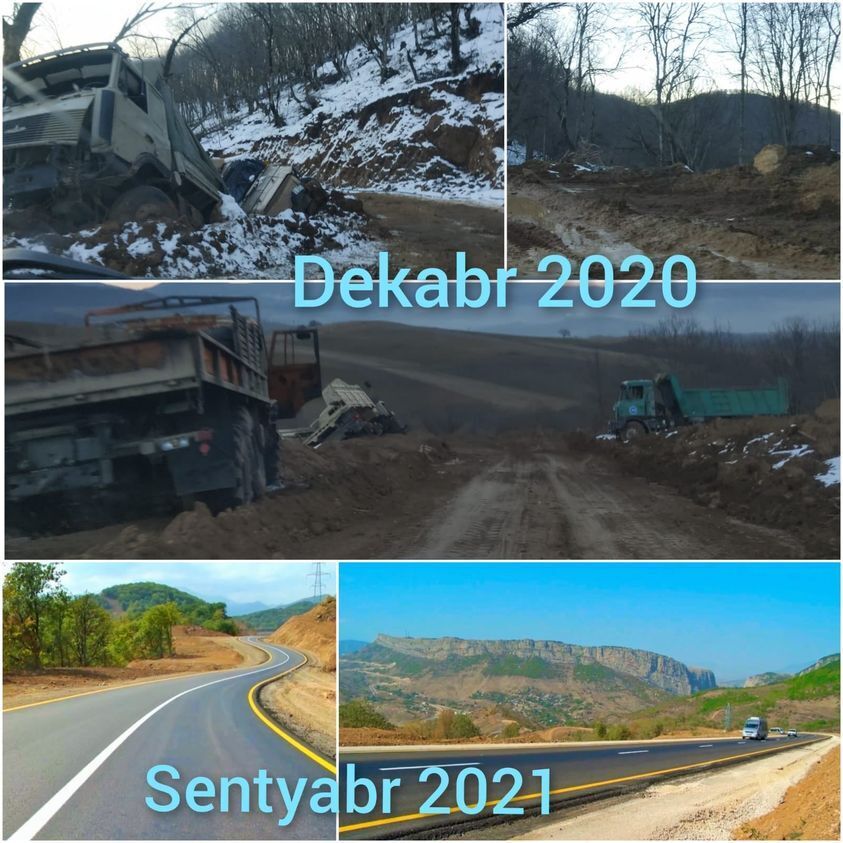 На фото коллаж участника войны, журналиста Алиполада. Верхние три снимка - дорога Победы, прорубленная в Гарабахе до города Шуша азербайджанской армией. По ней, через горный лет в Шушу прошел легковооруженный спецназ и освободил этот город от варваров. На нижних фото эта дорога сегодня. На днях она будет запущена в эксплуатацию, соединив Физули с Шушой