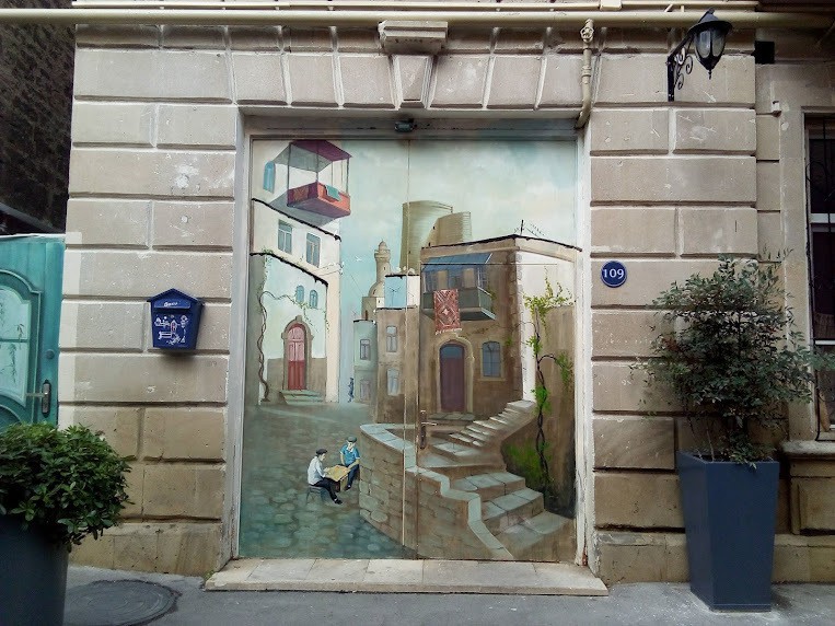 На ул. Гулиева художники прошлись по стенам и дверям (воротам) изобразив чудеса, сказочное видение творческих людей. Предлагаю читателям самим разобраться где я снял настоящую дверь или ворота такими, как они есть, а где на дверях (воротах) работала кисть художника.