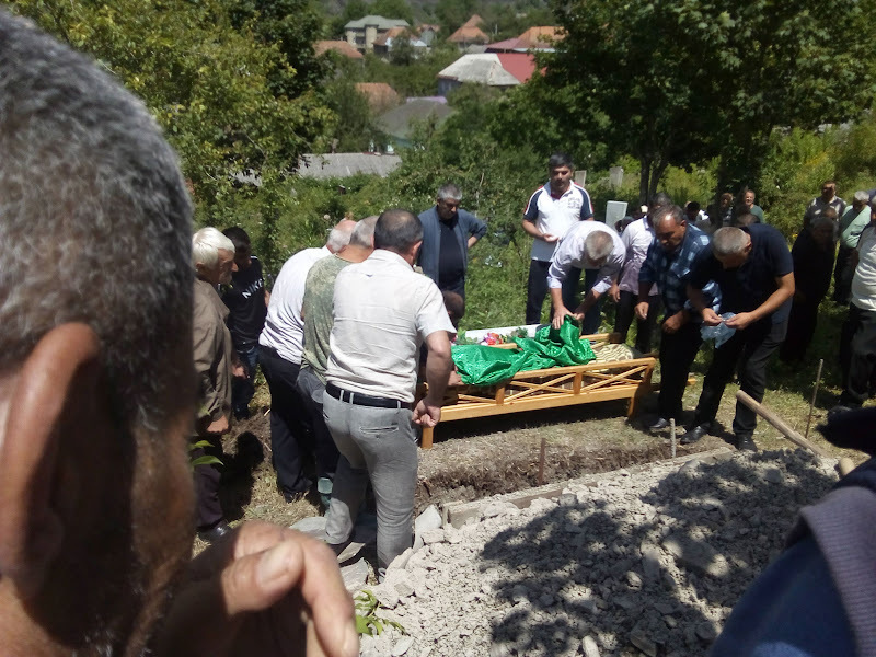 Прежде самый умелый в этом деле обозначил границы могилы, с верхней стороны по горе, в землю вкололи колышки, удерживающие пару досок, за которые вверх кидали землю. Потом, после похорон колышки убираются вместе с досками, и земля сама сыпется в могилу, конечно, ее направляют лопатами.