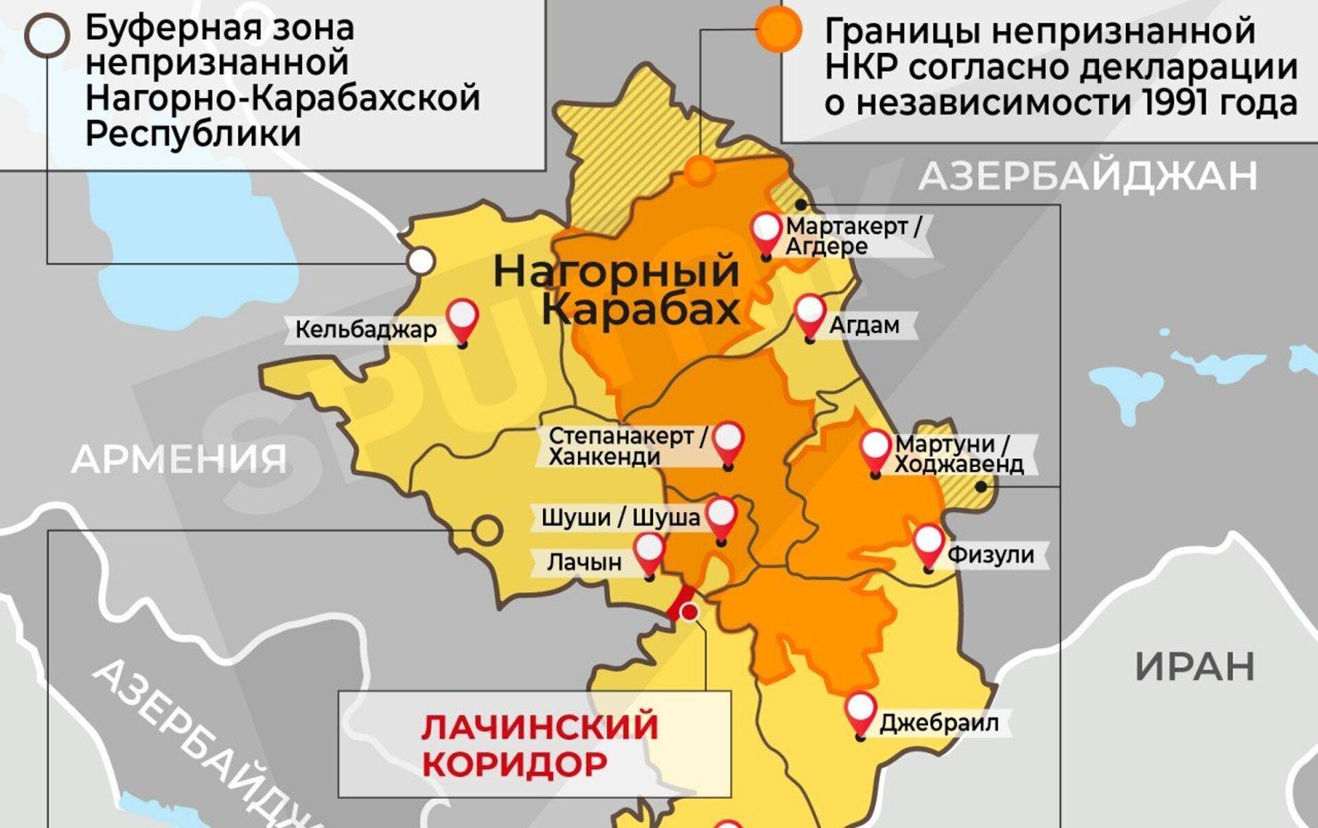 Карта "буферной зоны", она же "пояс безопасности", созданной армянами на территории Азербайджана по итогам первой карабахской войны (окрашена желтым цветом). Теперь Азербайджан создает аналогичную "зону" на территории Армении